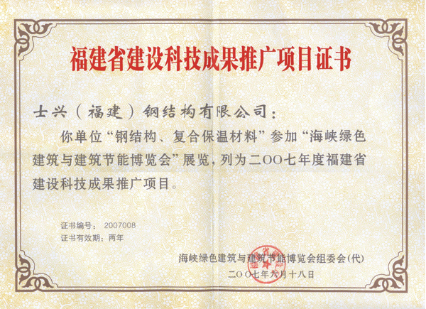 福建省建设科技成果推广项目证书