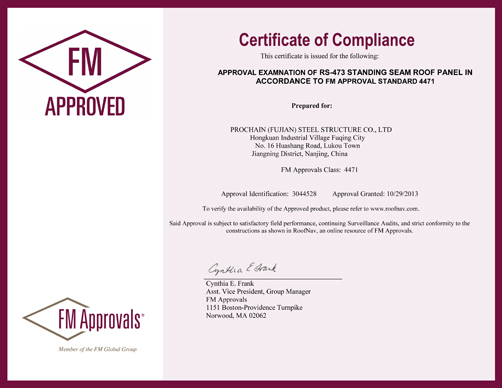 经过公司员工的辛勤努力和严格的评审过程,士兴(福建)钢结构有限公司的RS473+WS820双层钢结构屋面系统通过FM认证,荣获FM证书。